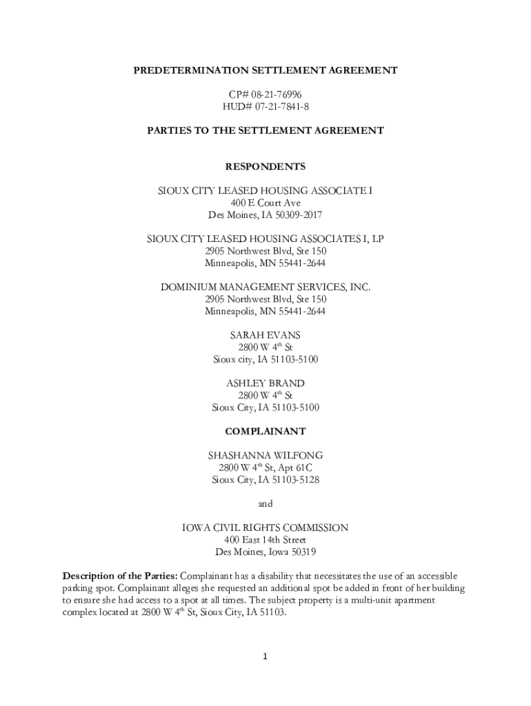 PREDETERMINATION SETTLEMENT AGREEMENT CP# 082176996 HUD# 072178418 PARTIES TO THE SETTLEMENT AGREEMENT RESPONDENTS SIOUX CITY LEASED HOUSING ASSOCIATE I 400 E Court Ave Des Moines, IA 503092017 SIOUX