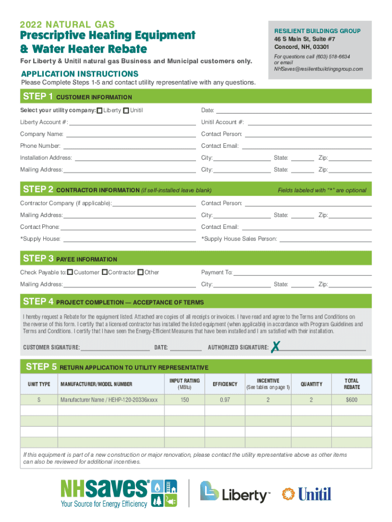 REBATES: COMMERCIAL HEATING EQUIPMENT & WATER HEATERS2022 NEW HAMPSHIRENatural Gas Commercial Rebates APPLICATION INSTRUCTIONS For Liberty & Until natural gas Business and Municipal customers only.