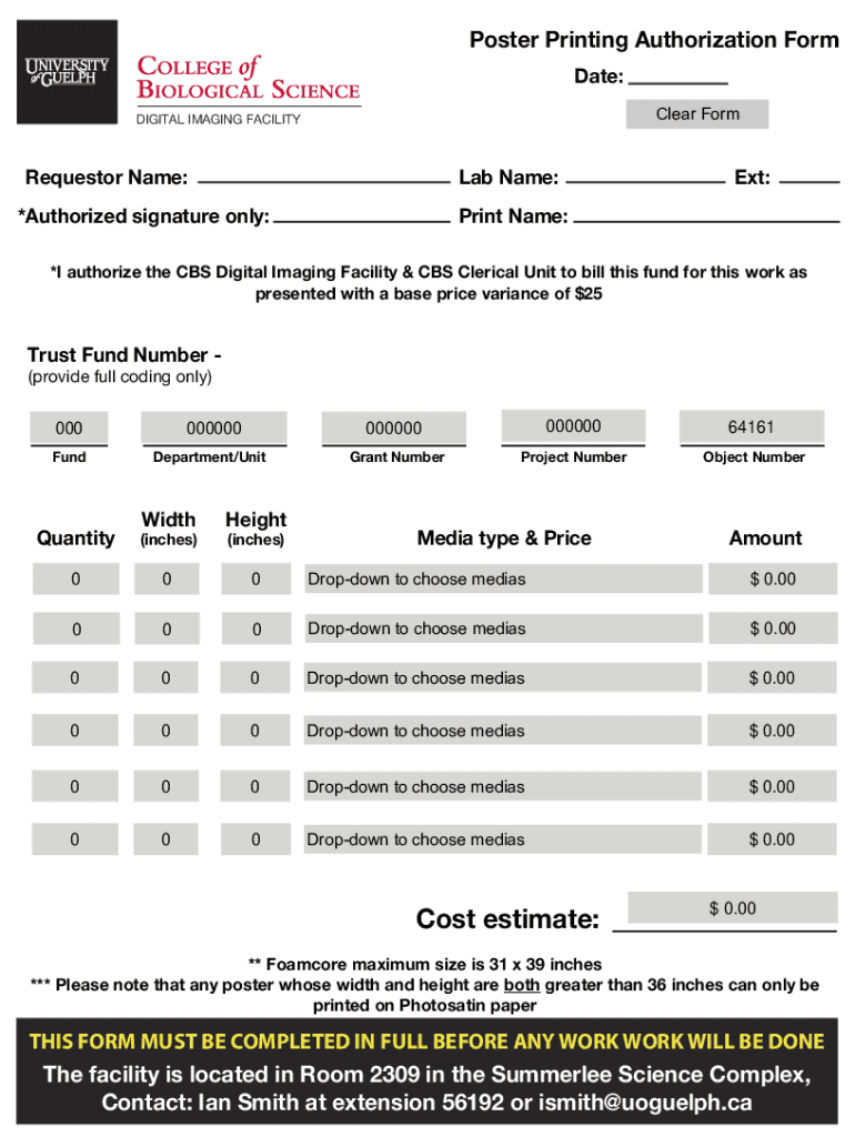 Poster Printing Authorization Form Date: Clear FormDIGITAL IMAGING FACILITYRequestor Name:Lab Name:*Authorized signature only:Ext:Print Name:*I authorize the CBS Digital Imaging Facility & CBS Clerical