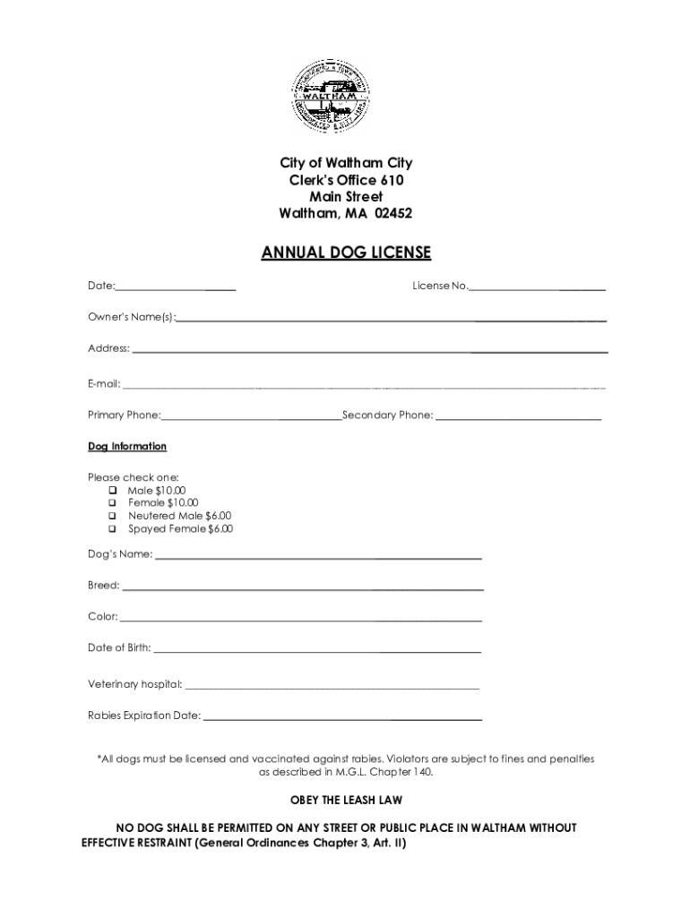 City of Waltham City Clerk\'s Office 610 Main Street Waltham, MA 02452ANNUAL DOG LICENSE Date:___License No. Owners Name(s):___ ___Address:___Email: ___ Primary Phone:___ Secondary Phone: ___Dog Information