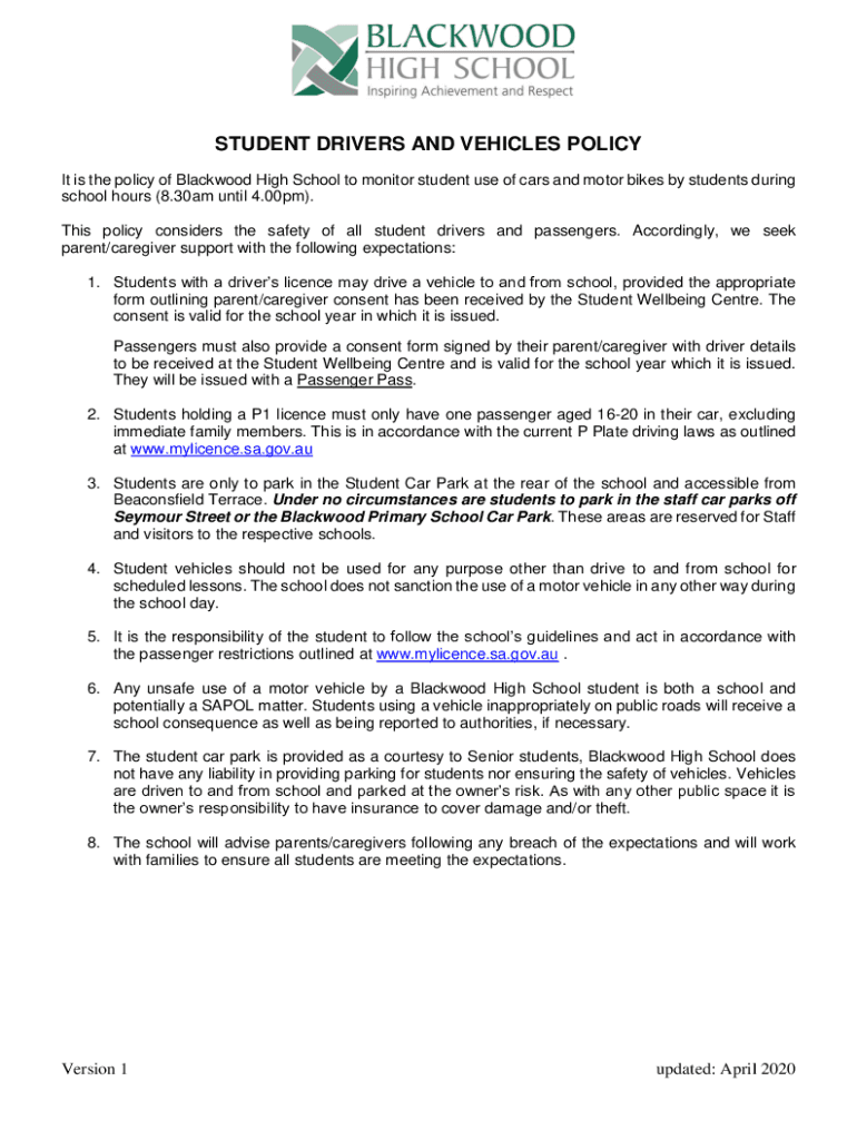 STUDENT DRIVERS AND VEHICLES POLICY It is the policy of Blackwood High School to monitor student use of cars and motorbikes by students during school hours (8.30am until 4.00pm). This policy considers