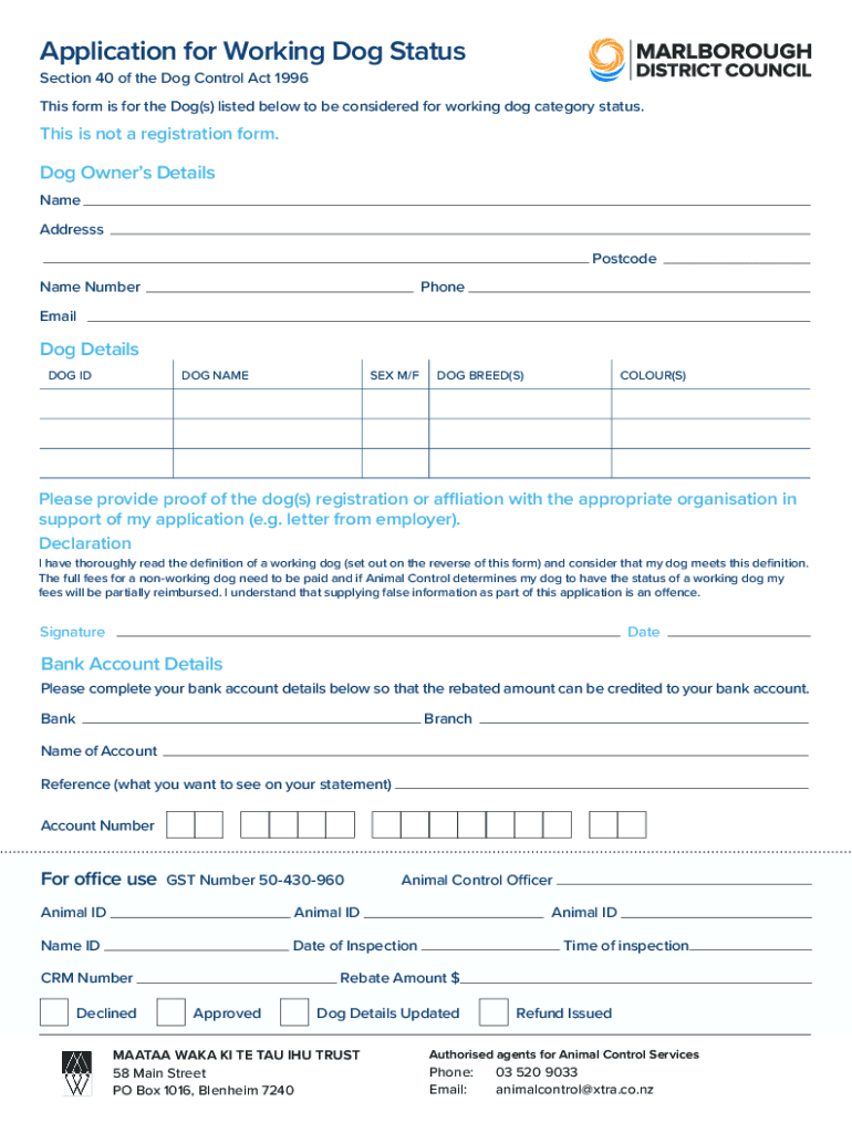 Application for Working Dog Status Section 40 of the Dog Control Act 1996This form is for the Dog(s) listed below to be considered for working dog category status. This is not a registration form.