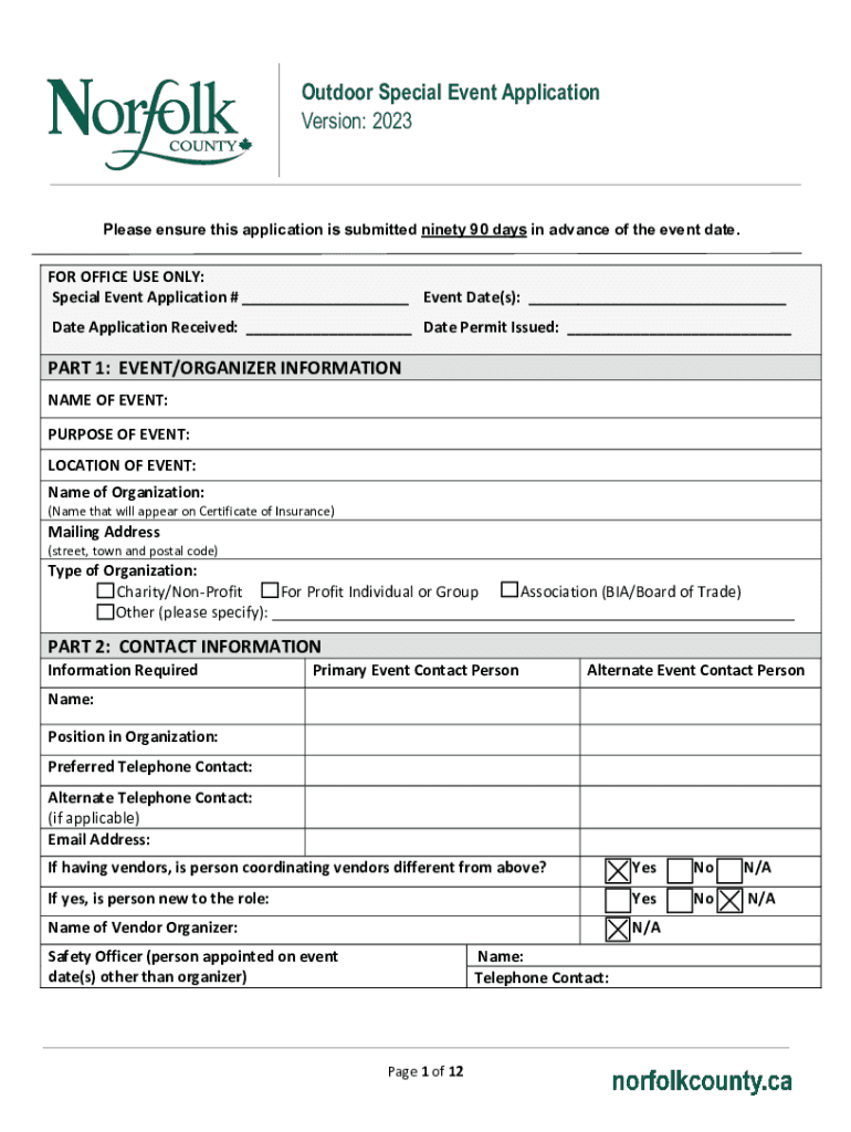 This document contains both information and form fields. To read information, use the Down Arrow from a form field. Outdoor Special Event Application Version: 2023Please ensure this application is