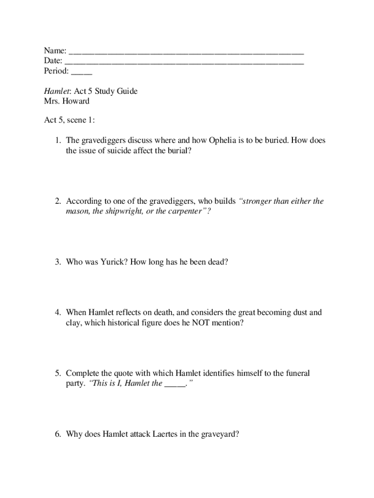Name: ___ Date: ___ Period: ___ Hamlet: Act 5 Study Guide Mrs. Howard Act 5, scene 1: 1. The gravediggers discuss where and how Ophelia is to be buried. How does the issue of suicide affect the burial?2.