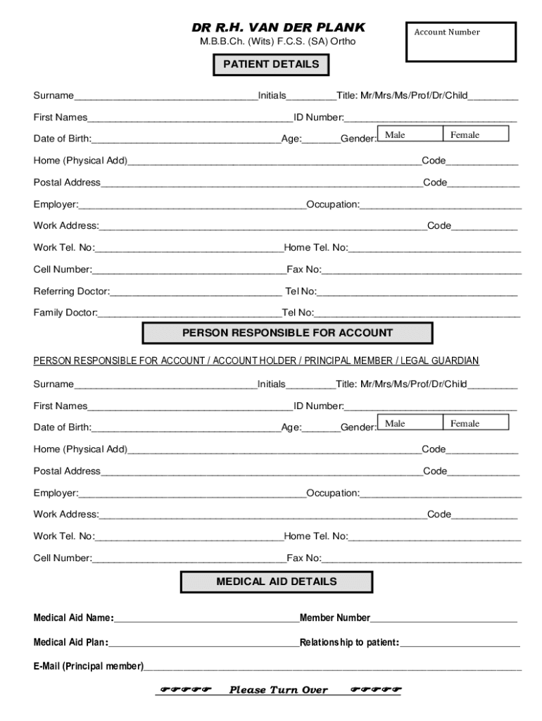 DR R.H. VAN HER PLANKAccount Number. B.B. Ch. (Wits) F.C.S. (SA) Outpatient DETAILS Surname___Initials___Title: Mr/Mrs/Ms/Prof/Dr/Child___ First Names___ID Number:___ Date of Birth:___Age:___Gender: