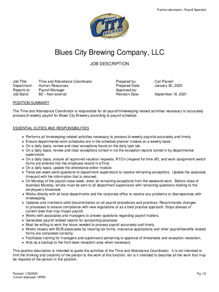 Position description Payroll SpecialistBlues City Brewing Company, LLC