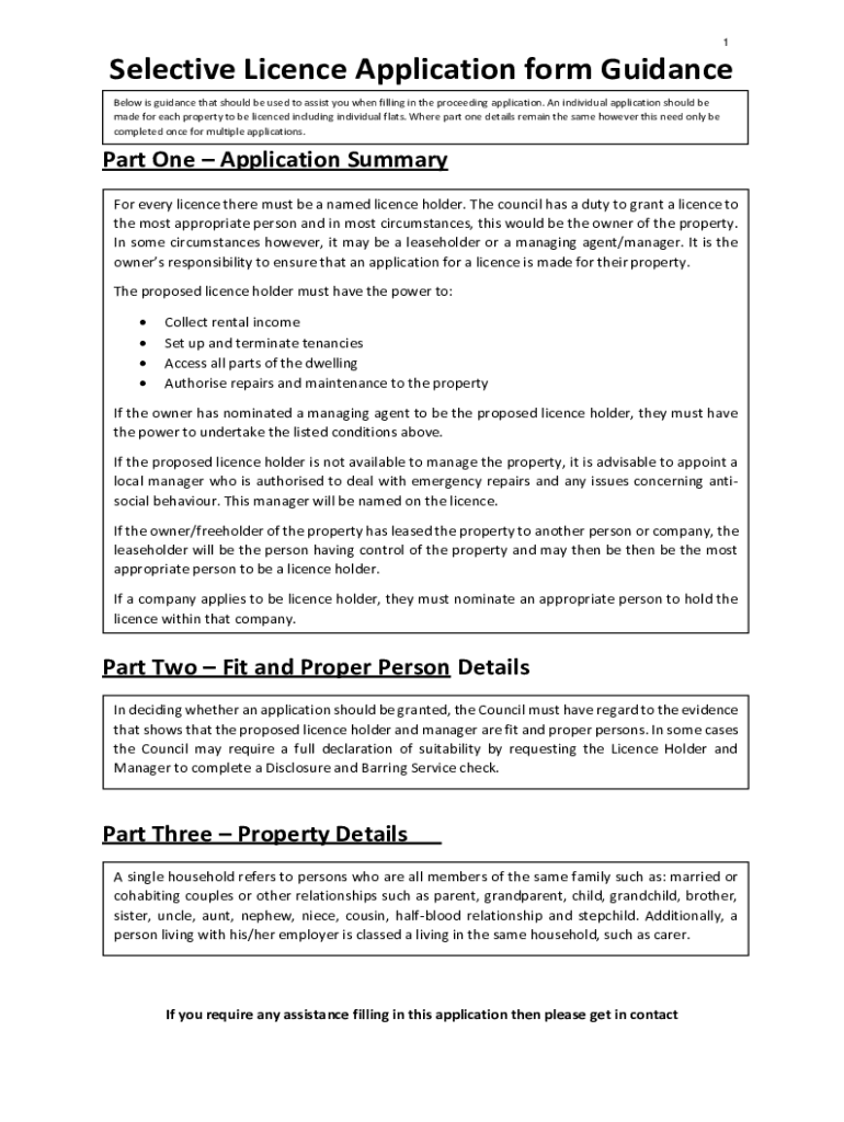 1Selective License Application form Guidance Below is guidance that should be used to assist you when filling in the proceeding application. An individual application should be made for each property