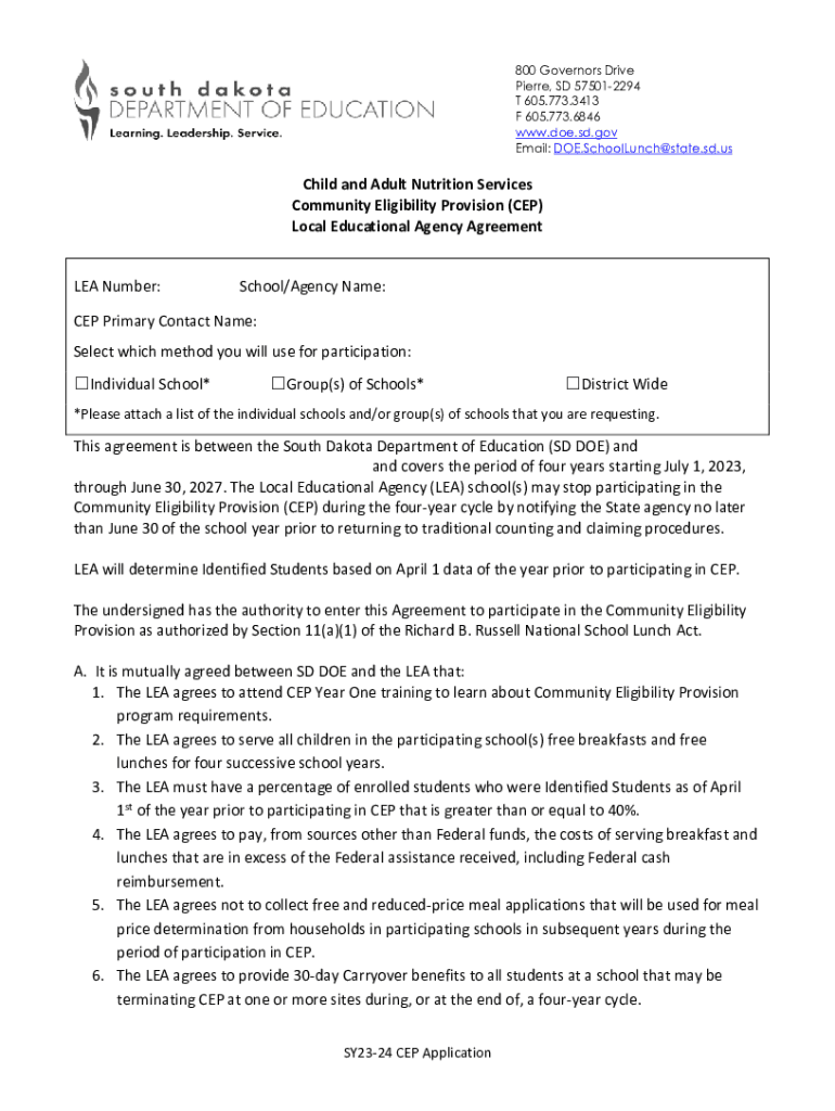 800 Governors Drive Pierre, SD 575012294 T 605.773.3413 F 605.773.6846 www.doe.sd.gov Email: DOE.SchoolLunch@state.sd.usChild and Adult Nutrition Services Community Eligibility Provision Participation