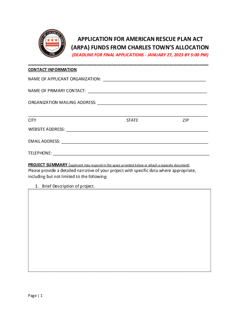 APPLICATION FOR AMERICAN RESCUE PLAN ACT (ARPA) FUNDS FROM CHARLES TOWNS ALLOCATION (DEADLINE FOR FINAL APPLICATIONS JANUARY 27, 2023, BY 5:00 PM)___ CONTACT INFORMATIONAL OF APPLICANT ORGANIZATION: