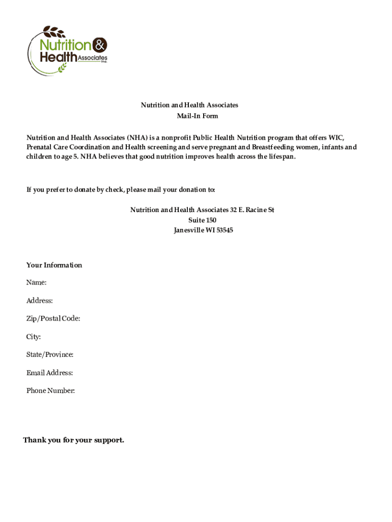 Nutrition and Health Associates Mailing Form Nutrition and Health Associates (NHA) is a nonprofit Public Health Nutrition program that offers WIC, Prenatal Care Coordination and Health screening and