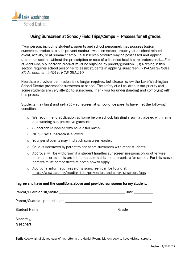Obtain consent forms from parents or guardians for each student to use sunscreen at school.