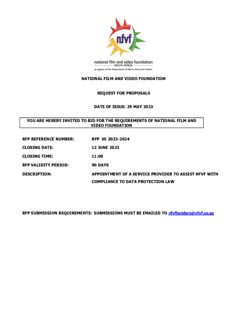 NATIONAL FILM AND VIDEO FOUNDATION REQUEST FOR PROPOSALS DATE OF ISSUE: 29 MAY 2023 YOU ARE HEREBY INVITED TO BID FOR THE REQUIREMENTS OF NATIONAL FILM AND VIDEO FOUNDATION RFP REFERENCE NUMBER:RFP
