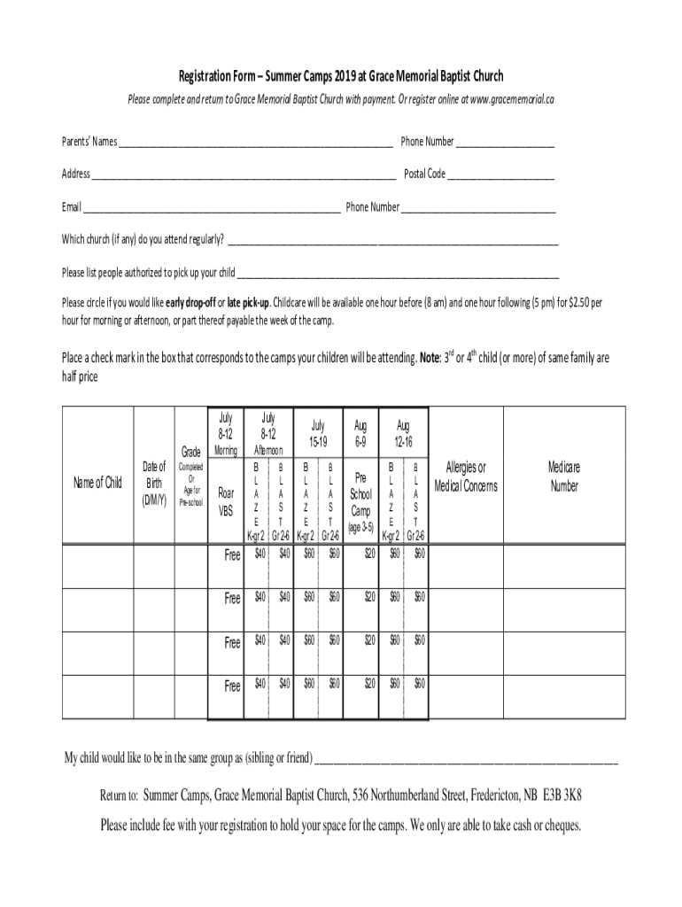 Get the free Summer Camps Registration - Grace Memorial Baptist Church