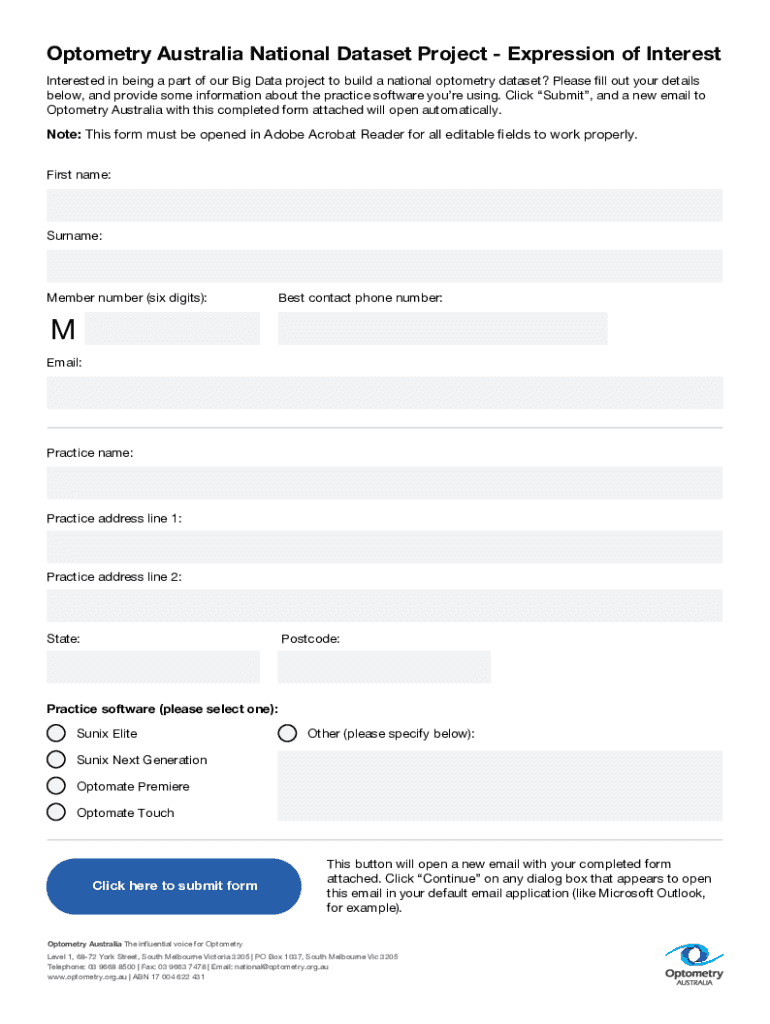 Optometry Australia National Dataset Project Expression of Interest Interested in being a part of our Big Data project to build a national optometry dataset? Please fill out your details below, and