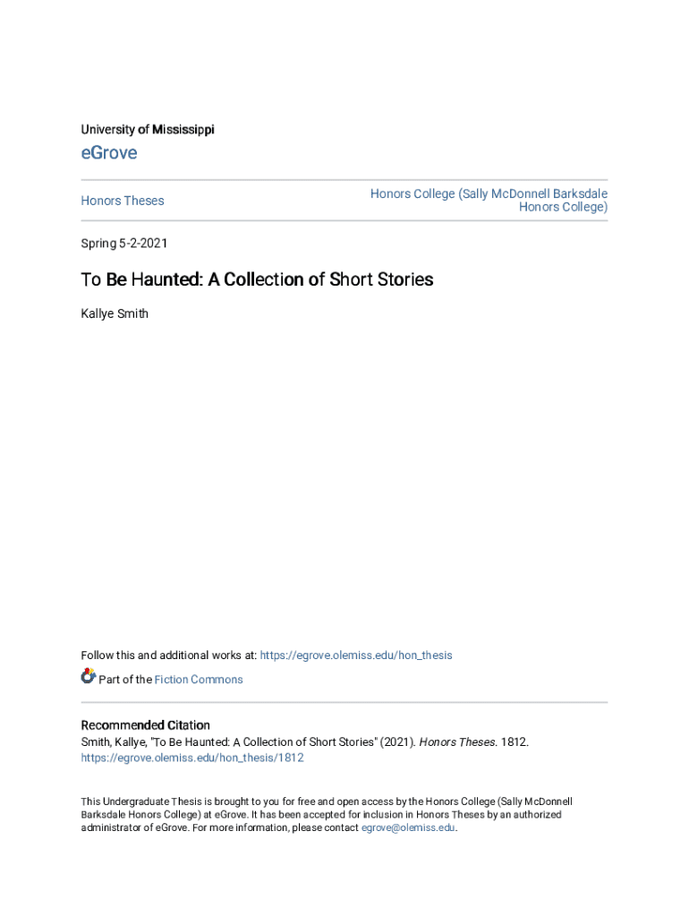 University of MississippieGrove Honors ThesesHonors College (Sally McDonnell Barks dale Honors College)Spring 522021To Be Haunted: A Collection of Short Stories Valley SmithFollow this and additional