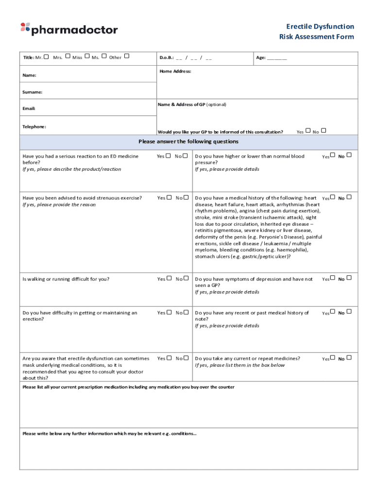Erectile Dysfunction Risk Assessment Form Title: Mr. Mrs. Misses. Other.o.B.: _ _ / _ _ / _ _Age: ___Home Address:Name:Surname: Name & Address of GP (optional)Email:Telephone: Would you like your