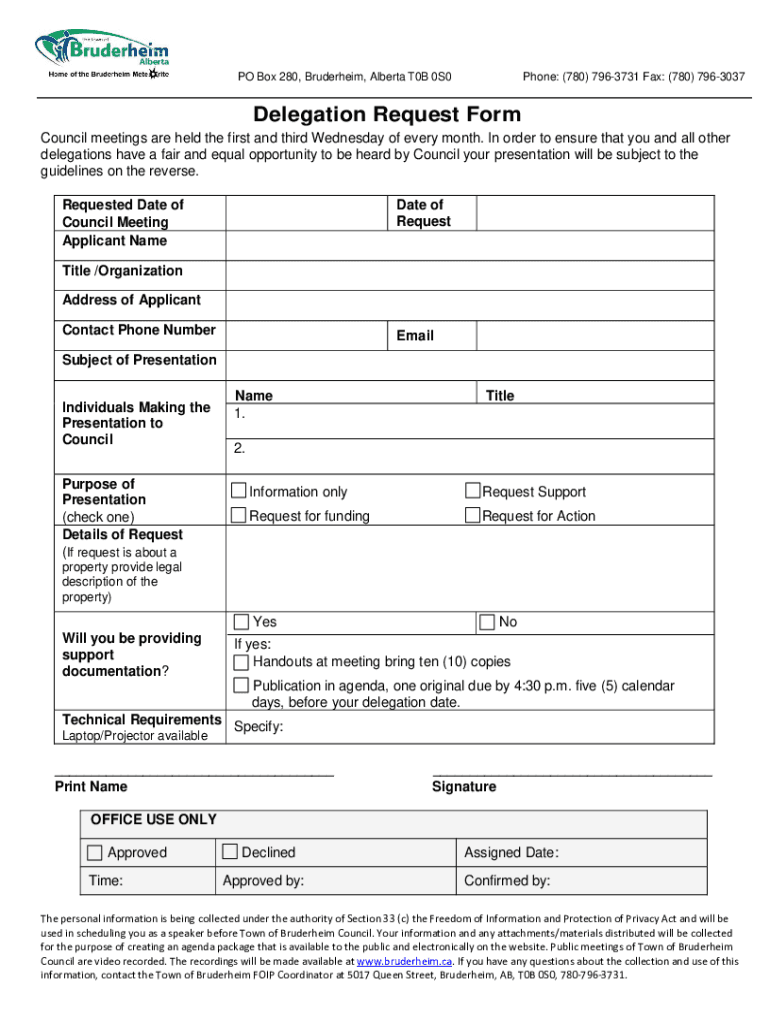PO Box 280, Bruderheim, Alberta T0B 0S0Phone: (780) 7963731 Fax: (780) 7963037Delegation Request Form Council meetings are held the first and third Wednesday of every month. In order to ensure that