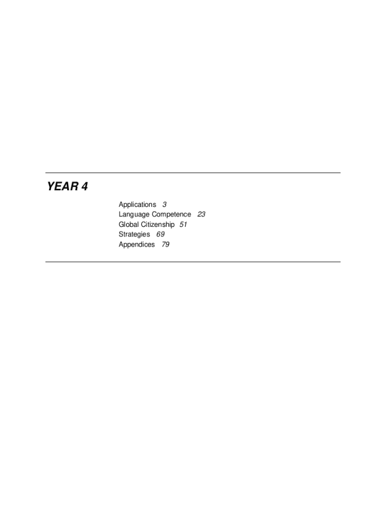 YEAR 4 Applications 3 Language Competence 23 Global Citizenship 51 Strategies 69 Appendices 79APPLICATIONS YEAR 4form, maintain, and change interpersonal relationships impart and receive information