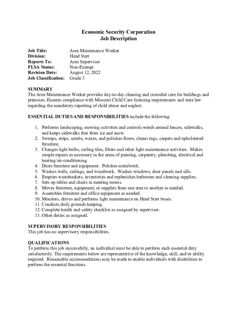 Economic Security Corporation Job Description Job Title: Division: Reports To: FLEA Status: Revision Date: Job Classification:Area Maintenance Worker Head Start Area Supervisor Nonexempt August 12,