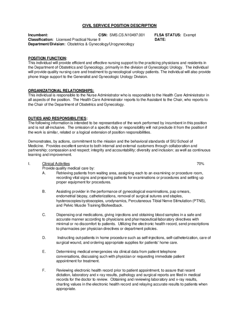 CIVIL SERVICE POSITION DESCRIPTION Incumbent: CAN: SMS.CS. N10497.001 Classification: Licensed Practical Nurse II Department/Division: Obstetrics & Gynecology/UrogynecologyFLSA STATUS: Exempt DATE:POSITION