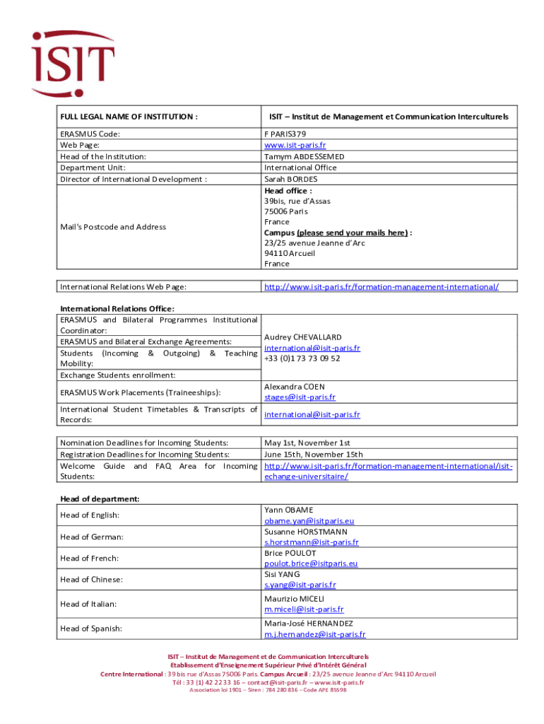 FULL LEGAL NAME OF INSTITUTION : ERASMUS Code: Web Page: Head of the Institution: Department Unit: Director of International Development :Mail\'s Postcode and AddressInternational Relations Web Page:VISIT