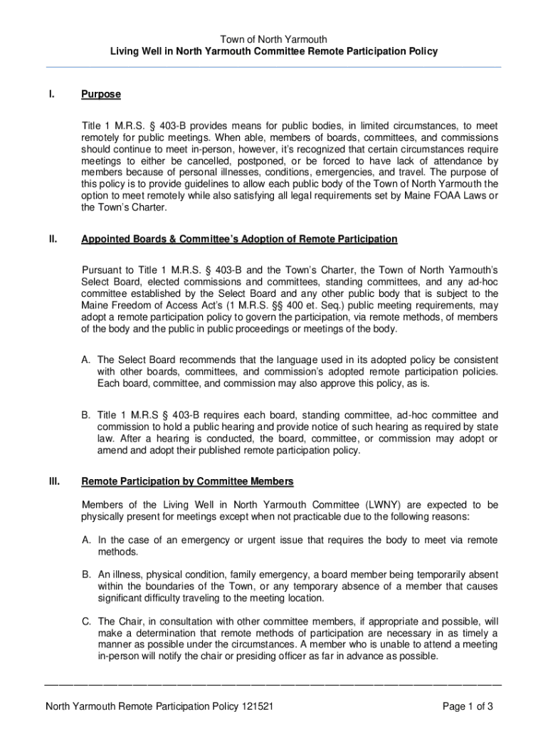 Town of North Yarmouth Living Well in North Yarmouth Committee Remote Participation Policy ___ I. Purpose Title 1 M.R.S. 403B provides means for public bodies, in limited circumstances, to meet remotely