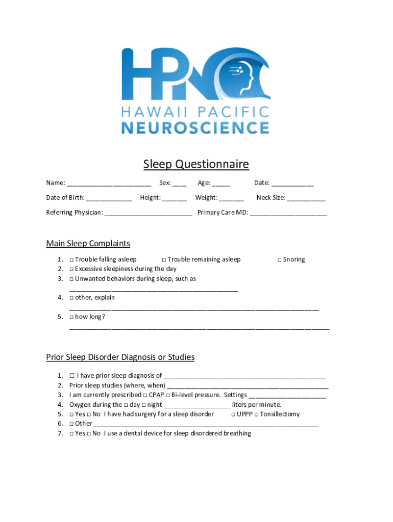 Sleep Questionnaire Name: ___ Date of Birth: ___Sex: ___Height: ___Age: ___ Weight: ___Date: ___ Neck Size: ___Referring Physician: ___ Primary Care MD: ___Main Sleep Complaints 1. Trouble falling