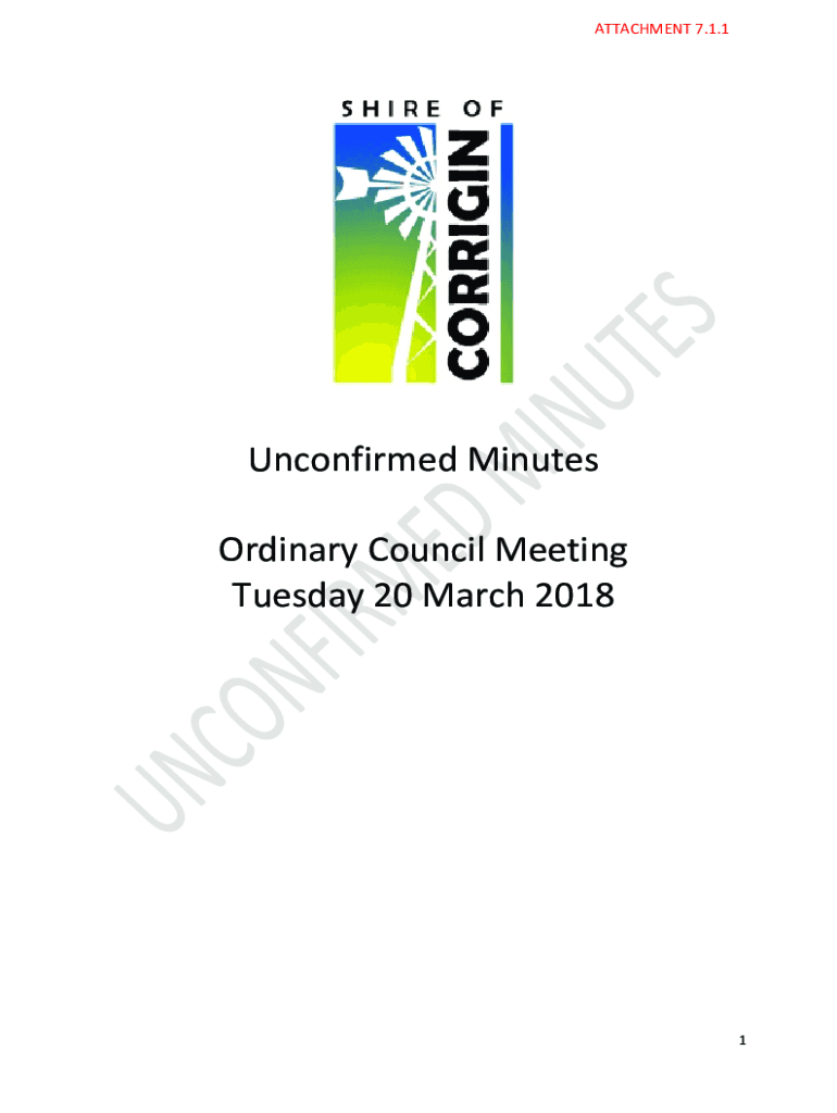 ATTACHMENT 7.1.1Unconfirmed Minutes Ordinary Council Meeting Tuesday 20 March 20181Table of Contents 1.DECLARATION OF OPENING ......................................................................................................