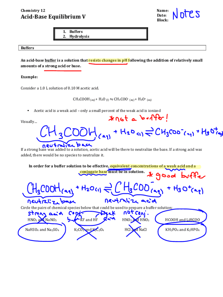 Chemistry12Name: Date: Block:AcidBaseEquilibriumV 1. Buffers 2. Hydrolysis BuffersAnacidbasebufferisasolutionthatresistschangesinpHfollowingtheadditionofrelativelysmall amountsofastrongacidorbase.