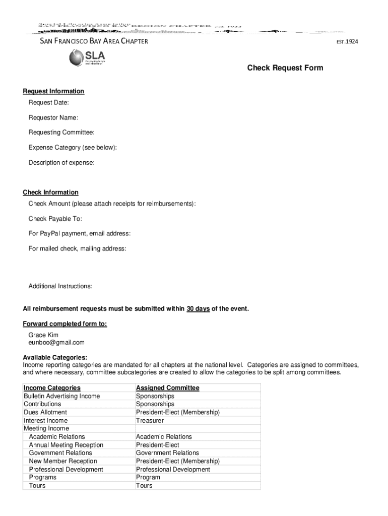 SAN FRANCISCO BAY AREA CHAPTER EST.1924Check Request Form Request Information Request Date: Requestor Name: Requesting Committee: Expense Category (see below): Description of expense:Check Information