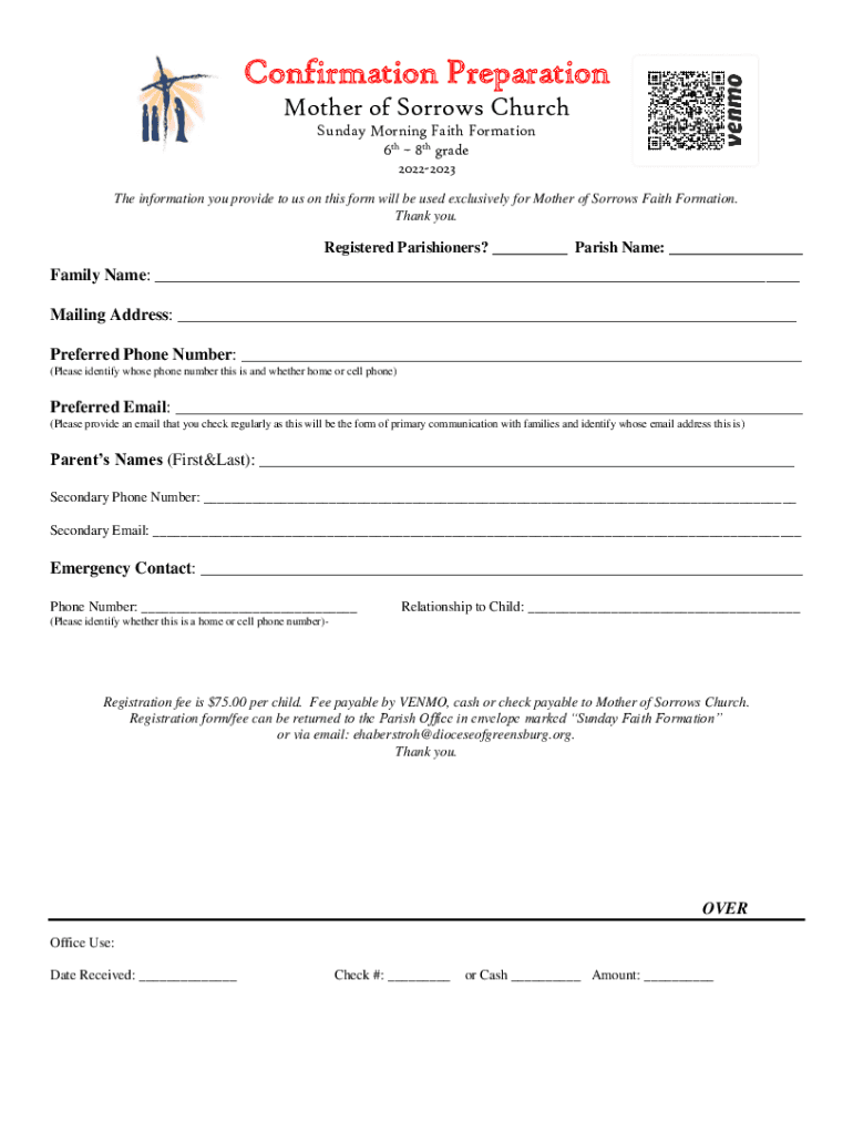 Confirmation Preparation Mother of Sorrows Church Sunday Morning Faith Formation 6th 8th grade 20222023 The information you provide to us on this form will be used exclusively for Mother of Sorrows