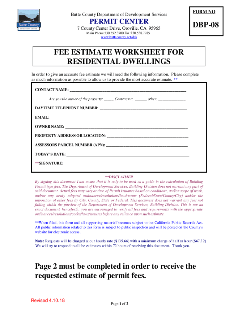 Butte County Department of Development ServicesPERMIT CENTER 7 County Center Drive, Orville, CA 95965FORM NODBP08Main Phone 530.552.3700 Fax 530.538.7785 www.buttecounty.net/ddsFEE ESTIMATE WORKSHEET
