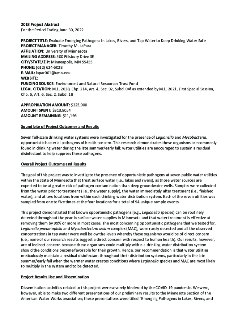 2018 Project Abstract For the Period Ending June 30, 2022, PROJECT TITLE: Evaluate Emerging Pathogens in Lakes, Rivers, and Tap Water to Keep Drinking Water Safe PROJECT MANAGER: Timothy M. Sápara
