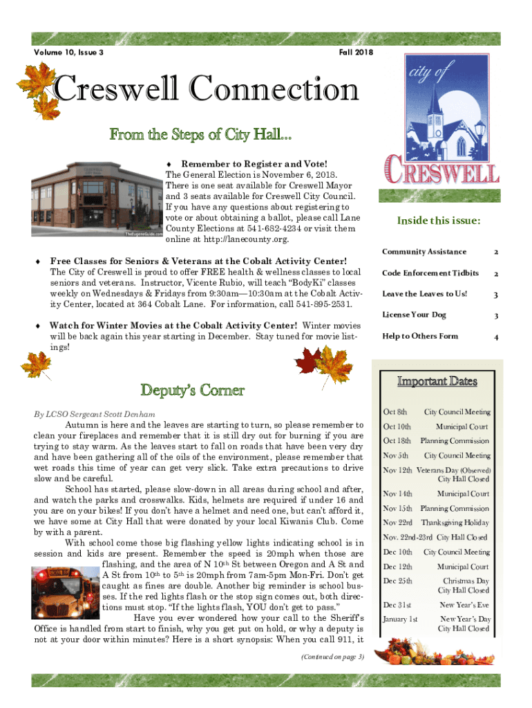Volume 10, Issue 3Fall 2018Creswell Connection From the Steps of City Hall... Remember to Register and Vote! The General Election is November 6, 2018. There is one seat available for Creswell Mayor