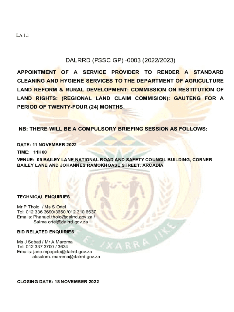 LA 1.1DALRRD (PSS GP) 0003 (2022/2023) APPOINTMENT OF A SERVICE PROVIDER TO RENDER A STANDARD CLEANING AND HYGIENE SERVICES TO THE DEPARTMENT OF AGRICULTURE LAND REFORM & RURAL DEVELOPMENT: COMMISSION