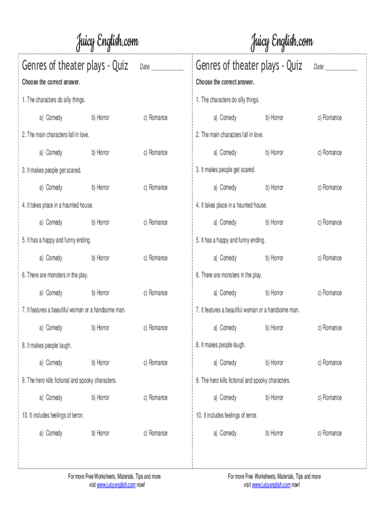 Juicy English.com Genres of theater plays QuizJuicy English.com Date: ___Genres of theater plays QuizChoose the correct answer. Choose the correct answer.1. The characters do silly things.1. The characters