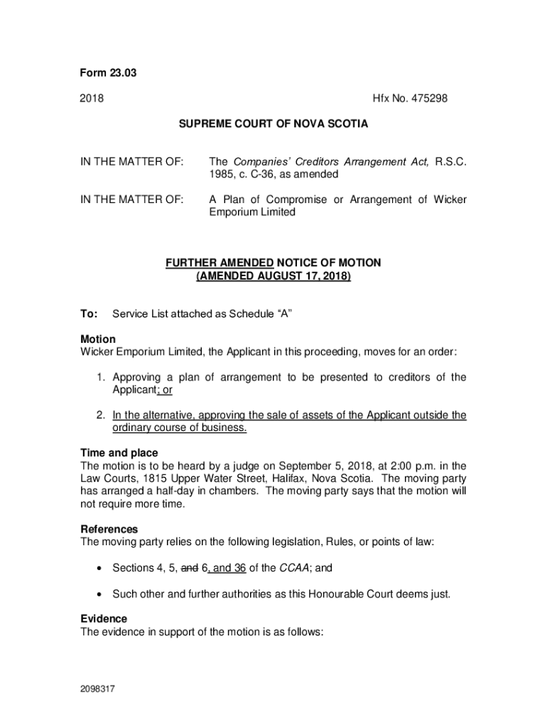 Form 23.03 2018Hfx No. 475298 SUPREME COURT OF NOVA SCOTIA THE MATTER OF:The Companies Creditors Arrangement Act, R.S.C. 1985, c. C36, as amended IN THE MATTER OF:A Plan of Compromise or Arrangement