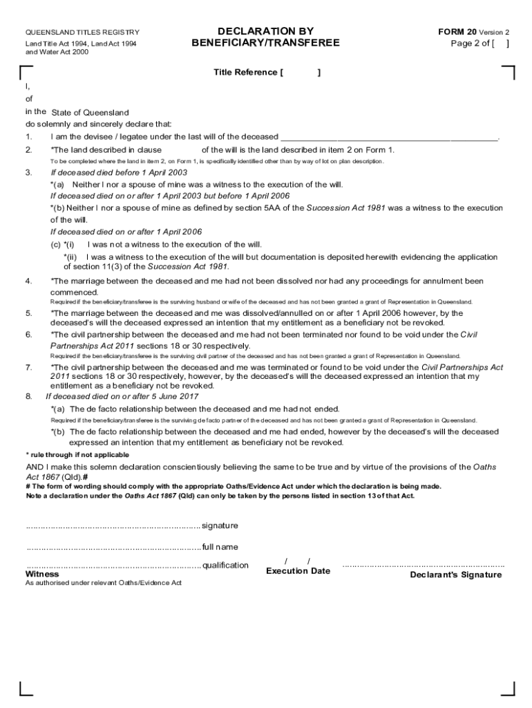 QUEENSLAND TITLES REGISTRY Land Title Act 1994, Land Act 1994 and Water Act 2000DECLARATION BY BENEFICIARY/TRANSFEREE Title Reference [FORM 20 Version 2-Page 2 of [ ]]I, of in the State of Queensland
