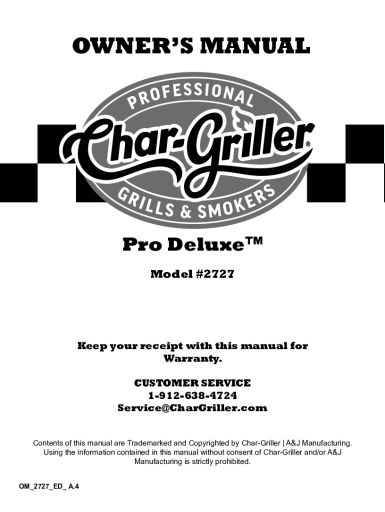 OWNERS Manual Deluxe Model #2727Keep your receipt with this manual for Warranty. CUSTOMER SERVICE 19126384724 Service@CharGriller.com Contents of this manual are Trademarked and Copyrighted by CharGriller