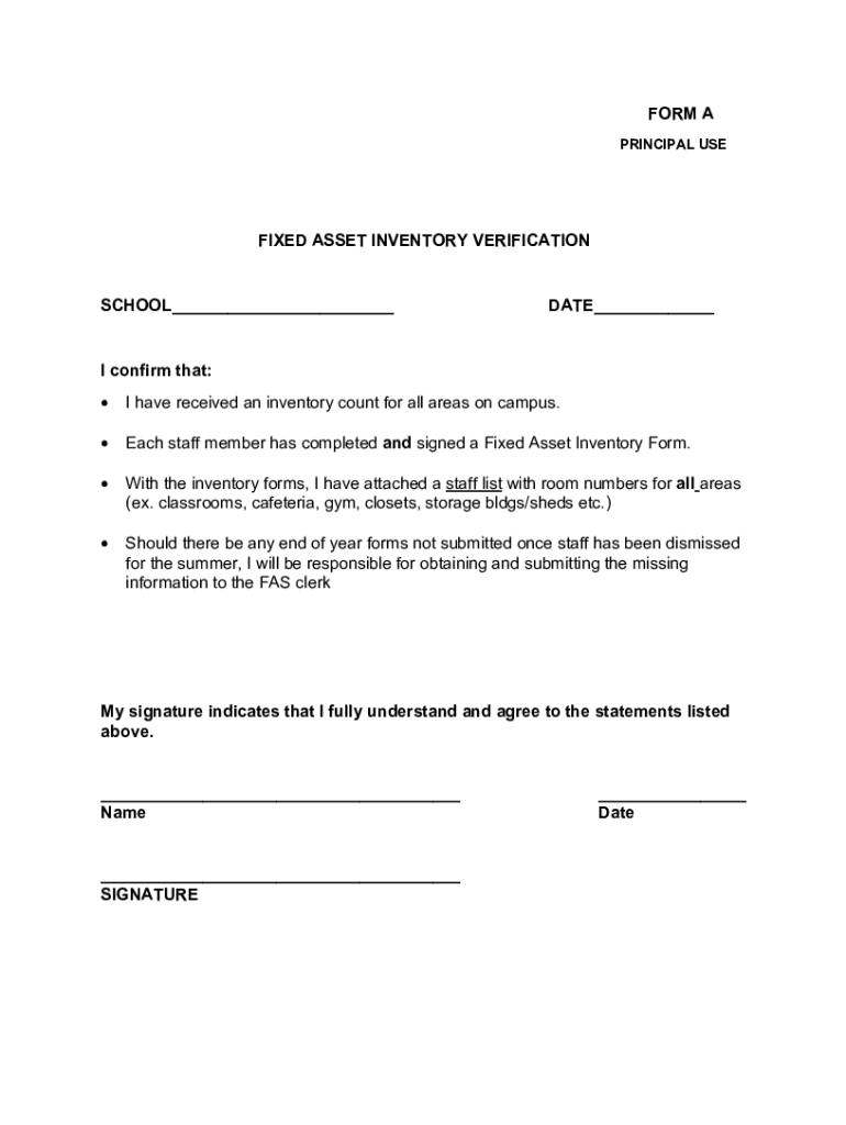FORM A PRINCIPAL PREFIXED ASSET INVENTORY VERIFICATIONSCHOOL___DATE___I confirm that: I have received an inventory count for all areas on campus. Each staff member has completed and signed a Fixed