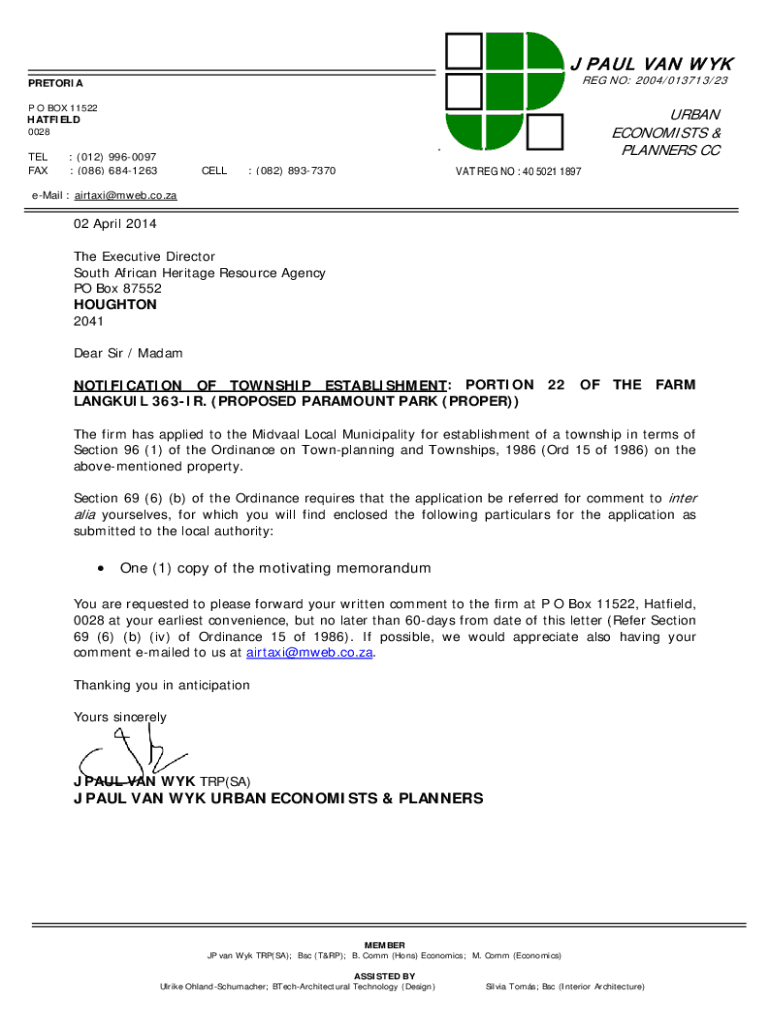 J P A UL VA N W Y K REG NO: 2004/013713/23PRETORIA P O BOX 11522 HATFIELD 0028TEL EXURBAN ECONOMISTS & PLANNERS CC.: (012) 9960097 : (086) 6841263CELL: (082) 8937370VAT REG NO : 40 5021 1897eMail