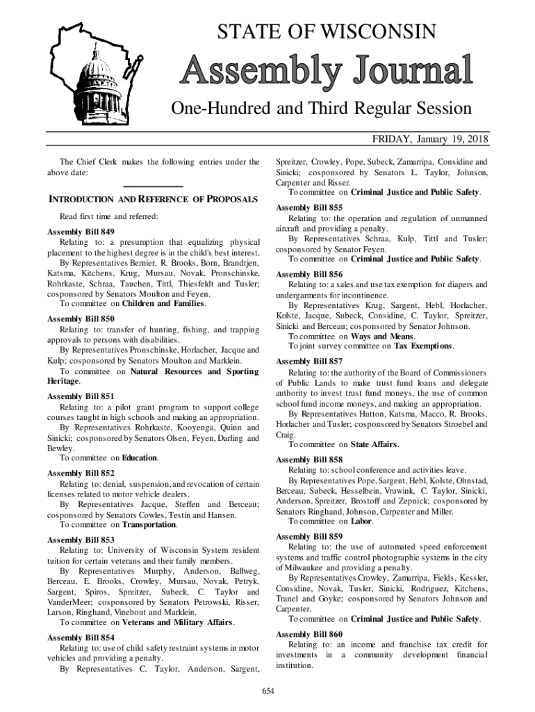 STATE OF WISCONSINOneHundred and Third Regular Session FRIDAY, January 19, 2018, The Chief Clerk makes the following entries under the above date: ___Spritzer, Crowley, Pope, Lübeck, Samaria, Confiding