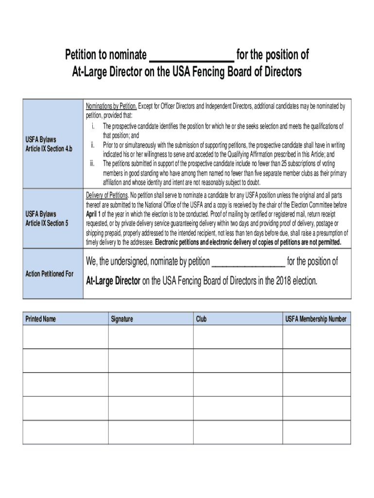 Petition to nominate ___ for the position of Large Director on the USA Fencing Board of DirectorsUSFA Bylaws Article IX Section 4.nominations by Petition. Except for Officer Directors and Independent