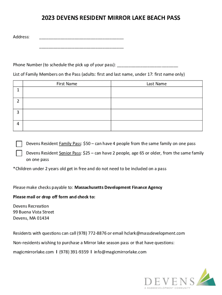 2023 SEVENS RESIDENT MIRROR LAKE BEACH PASS Address:___ ___Phone Number (to schedule the pickup of your pass): ___ List of Family Members on the Pass (adults: first and last name, under 17: first