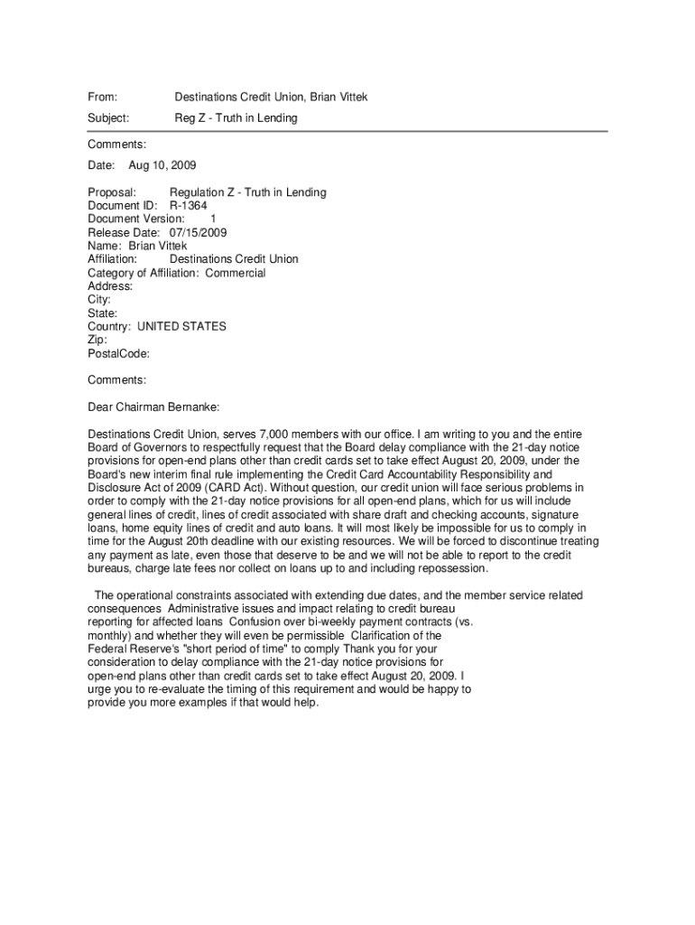 From:Destinations Credit Union, Brian VittekSubject:Reg Z Truth in LendingComments: Date:Aug 10, 2009Proposal: Regulation Z Truth in Lending Document ID: R1364 Document Version: 1 Release Date: 07/15/2009