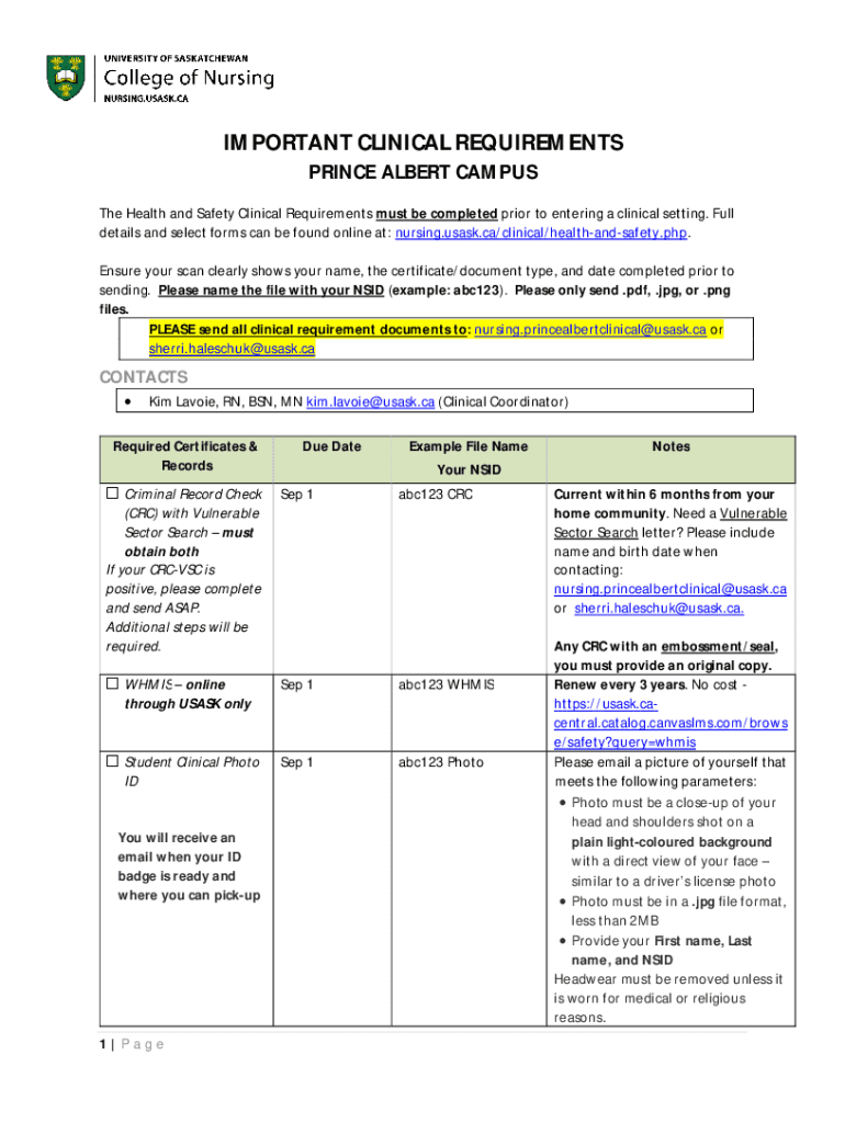 IMPORTANT CLINICAL REQUIREMENTS PRINCE ALBERT CAMPUS The Health and Safety Clinical Requirements must be completed prior to entering a clinical setting. Full details and select forms can be found