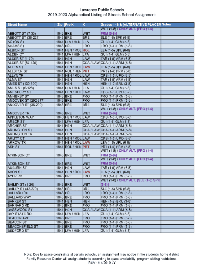 Lawrence Public Schools 20192020 Alphabetical Listing of Streets School Assignment Street Name PreKKABBOTT ST (733) ABBOTT ST (35221) ACTON ST ADAMS ST ALBION ST ALDEN CT ALDER ST (179) ALDER ST (87125)