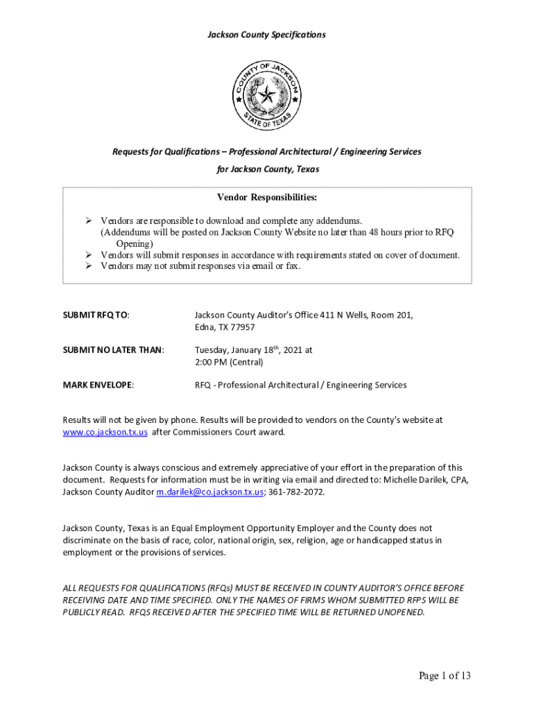 Jackson County SpecificationsRequests for Qualifications Professional Architectural / Engineering Services for Jackson County, Texas Vendor Responsibilities: Vendors are responsible to download and