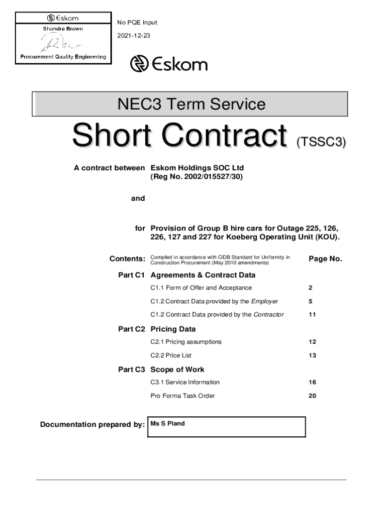 No PIE Input 20211223NEC3 Term Service Short Contract(TSSC3)A contract between Epsom Holdings SOC Ltd (Reg No. 2002/015527/30) and for Provision of Group B hire cars for Outage 225, 126, 226, 127