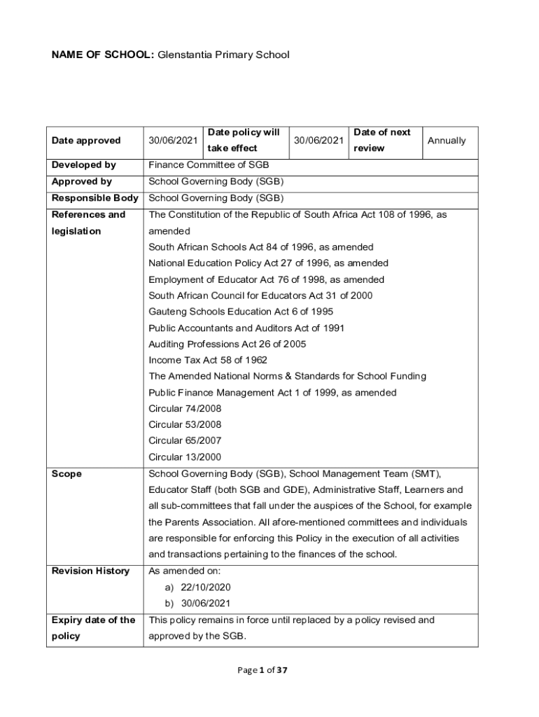 NAME OF SCHOOL: Glenstantia Primary Schoolmate policy village approved30/06/2021Developed finance Committee of Approved school Governing Body (SGB)take effect30/06/2021Date of next